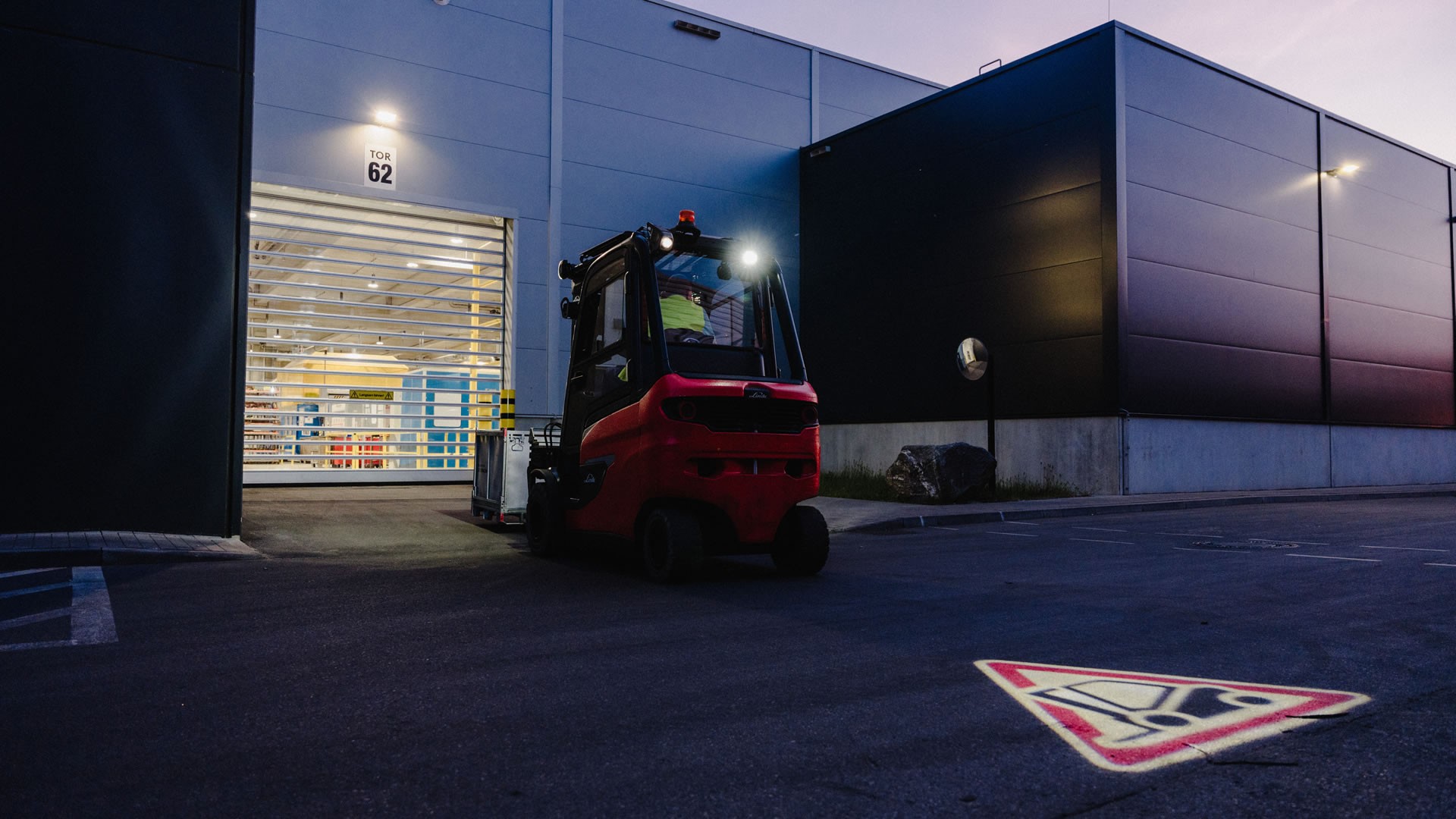 Un stivuitor Linde echipat cu Linde TruckSpot iese cu spatele din hală, la lăsarea serii.